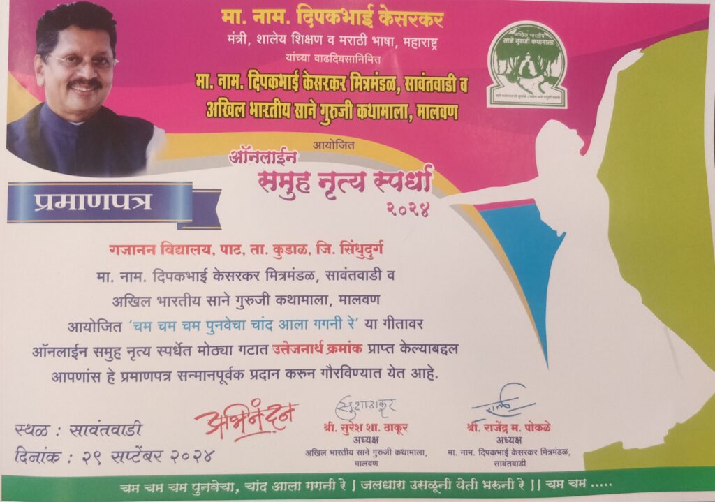 स्पर्धेसाठी एकूण १८४ शाळांनी भाग घेतला होता व या स्पर्धेत आपल्या गजानन विद्यालय, पाट शाळेला उत्तेजनार्थ पारितोषिक मिळाले. रविवार दिनांक २९ सप्टेंबर २०२४ रोजी आर. पि. डि. हायस्कूल, सावंतवाडी येथे हा बक्षीस वितरणाचा कार्यक्रम पार पडला. कार्यक्रमाला स्वतः दिपक केसरकर हजर होते.